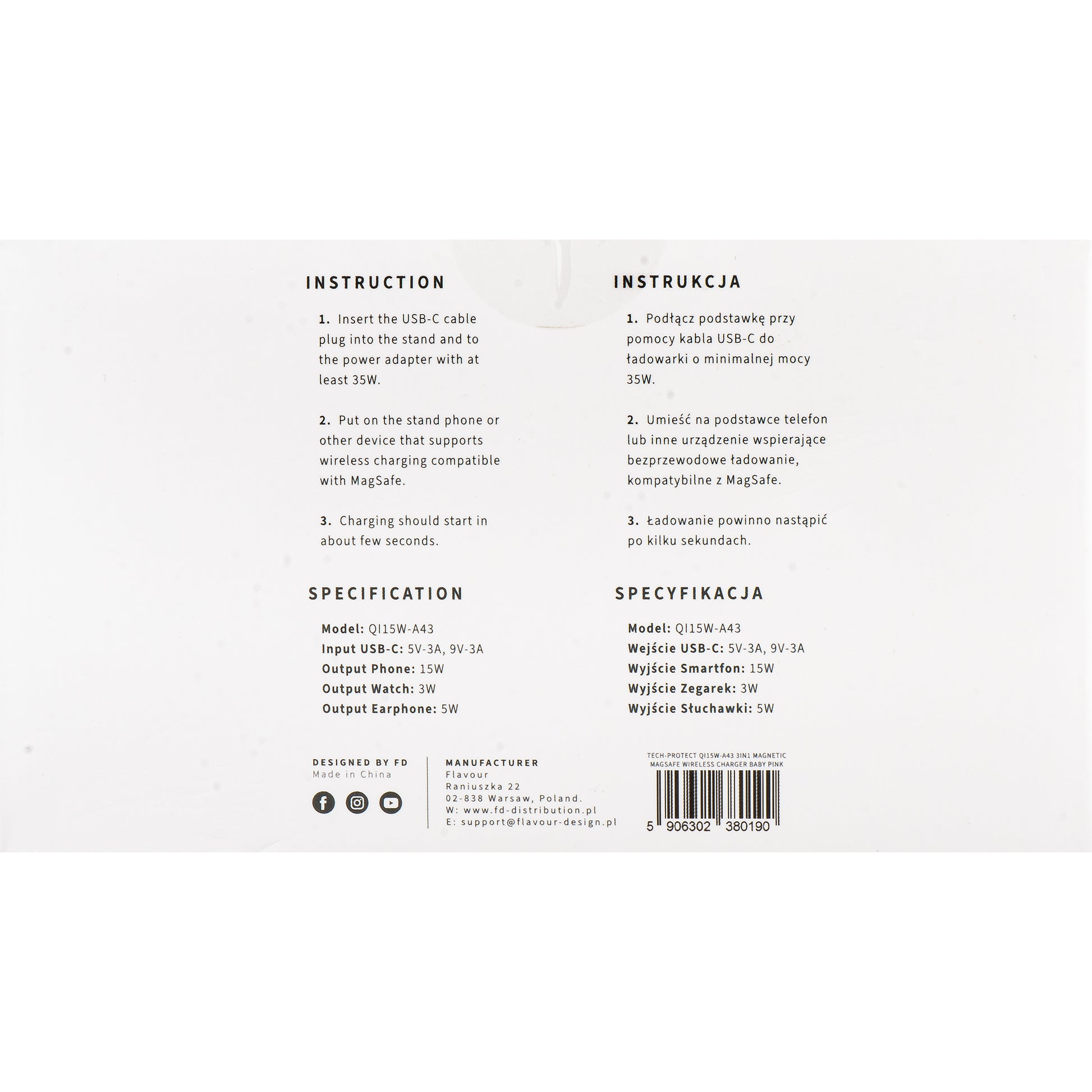 - 1 x Drahtloses Netzladegerät Tech-Protect QI15W-A43 3in1