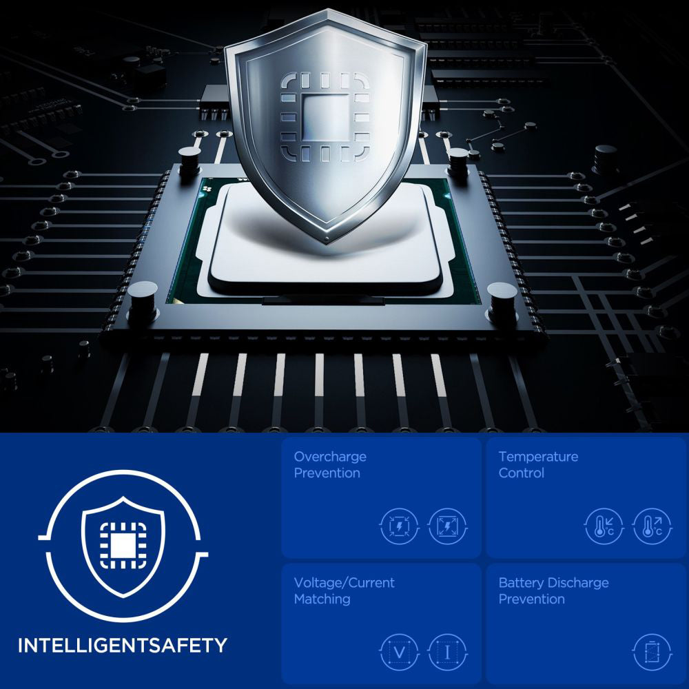 • Das IntelligentSafety-System bietet vollständigen Schutz durch Verhinderung von Überladung, Temperaturkontrolle und Batterieschutz für den sicheren täglichen Gebrauch.